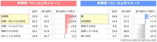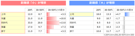 「距離感小」または「距離感大」を求める上司のイメージ差を、世代間で比較しています。