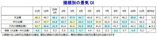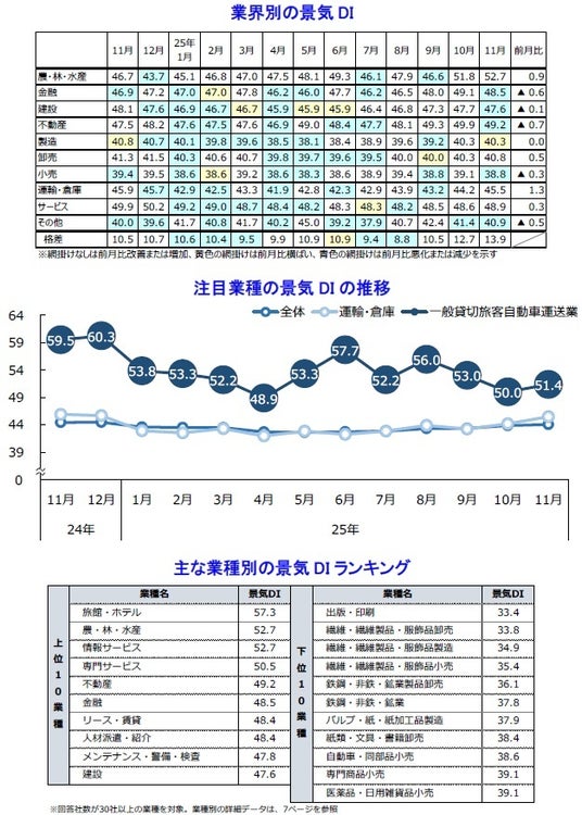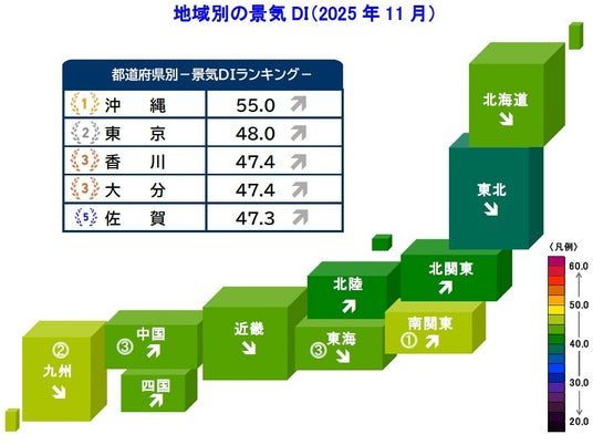 2025年11月の景気DIは44.1となり、前月比で0.2ポイント増加した。2020年11月以来5年ぶりに6カ月連続で改善。国内景気は、仕入単価の上昇が重しとなったものの、観光産業や半導体需要が好調で、改善傾向が続いた。