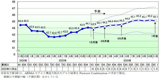 - 2025年11月の景気DIは前月比0.2ポイント増の44.1となり、2020年11月以来5年ぶりに6カ月連続で改善した。国内景気は、仕入単価の上昇が重しとなったものの、観光産業や半導体需要が好調で、改善傾向が続いた。今後の国内景気は、小幅な変動をともないながら、緩やかな改善基調が続く見通しである。