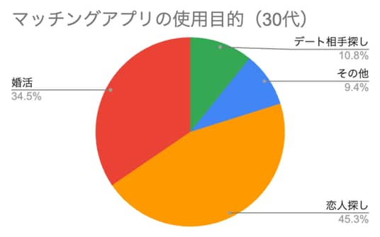 マッチングアプリの利用目的を調査したところ、最も多かったのは「恋人探し」が58.1%、次いで「婚活」19.6%、「デート相手探し」15.1%と続きます。
