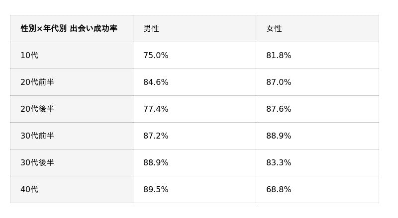 中でも30代の出会い成功率が特に高く、性別や年齢による大きな不利はないことが明らかになりました。
