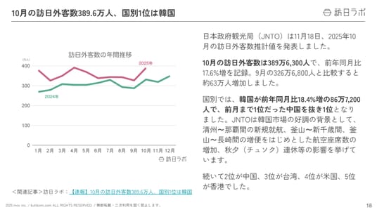 - 10月の訪日外客数389.6万人、国別1位は韓国