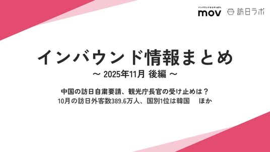 業界最大級のインバウンドビジネスメディア「訪日ラボ」及び 店舗向け集客一元化プラットフォーム「口コミコム」を運営する株式会社mov(代表取締役:渡邊 誠、本社:東京都渋谷区、以下mov)は、「インバウンドに関する最新トレンド・データ」「政府・自治体・企業などのインバウンド関連の取り組み」をはじめ、インバウンド対策に役立つニュースをまとめた「インバウンド情報まとめ【2025年11月後編】」を公開しました。