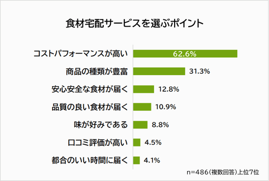 「食材宅配サービスを選ぶポイント」として、最も多かった回答は「コストパフォーマンスが高い(62.6%)」でした。2位は「商品の種類が豊富(31.3%)」、3位は「安心安全な食材が届く(13.0%)」となっています。