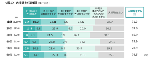 大掃除の時期が決まっている場合「12月下旬」と「12月上旬」と合わせて12月中に行う人は34.0%とボリュームゾーン。時期が決まっていない人は28.6%。20~30代は大掃除をしない人が多い。<図1>