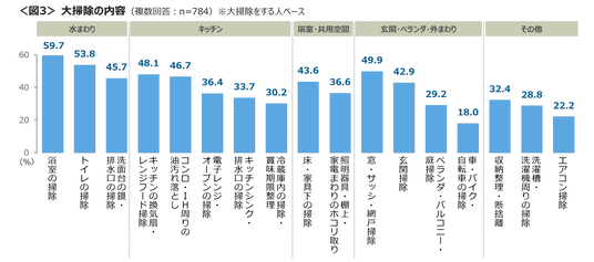 掃除内容は「浴室」「トイレ」「窓・サッシ・網戸」「キッチンの換気扇・レンジフード」「コンロ・IH周りの油汚れ落とし」が上位。<図3>