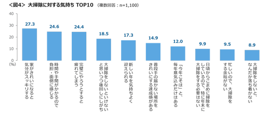 「家がきれいになると気分がスッキリする」「時間や手間がかかるので負担・面倒に感じる」「完璧にやろうとすると疲れてしまう」と大掃除に対する気持ちはポジティブとネガティブの双方が高い。<図4>