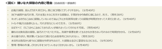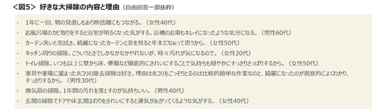 好きな掃除は「お風呂のカビ取り」や「換気扇掃除」など。嫌いな掃除は「カビや頑固な油汚れ」「お風呂・トイレ」などで、キッチン周りと水回りが多い。掃除の後はきれいにすることで気持ちが「穏やかになる」「さっぱりする」の声があがった。<図5・図6>