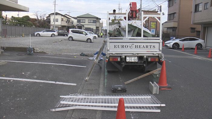 大型トラックはそのまま駐車場の脇のフェンスをなぎ倒し、およそ60メートルほど進んだ先にある住宅のブロック塀に衝突し、停まりました。