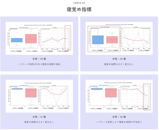 ・調査方法(集計方法、算出方法):PGV株式会社様が提供するパッチ式脳波測定機器を用いる。ハグモッチを活用せず3夜で測定後、次の3夜でハグモッチを使用した睡眠中の脳波測定を行う。