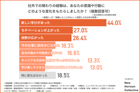 続いて、社外活動を『経験したことがない』と回答した方以外に、「社外活動がもたらした意識や行動の変化」について尋ねたところ、『新しい学びがあった(44.0%)』が最も多く、『モチベーションが上がった(27.0%)』『視野が広がった(26.4%)』と続きました。