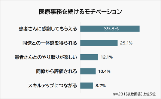 「医療事務を続けるモチベーション」を聞いたところ、1位は「患者さんに感謝してもらえる(39.8%)」2位「同僚との一体感を得られる(25.1%)」、3位「患者さんとのやり取りが楽しい(12.1%)」でした。