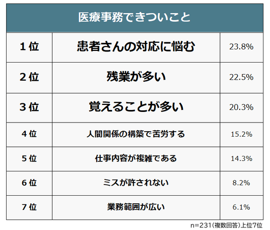 医療事務をしたことがある231人に「医療事務できついと感じること」を聞いたところ、1位は「患者さんの対応に悩む(23.8%)」でした。2位「残業が多い(22.5%)」、3位「覚えることが多い(20.3%)」が続きます。