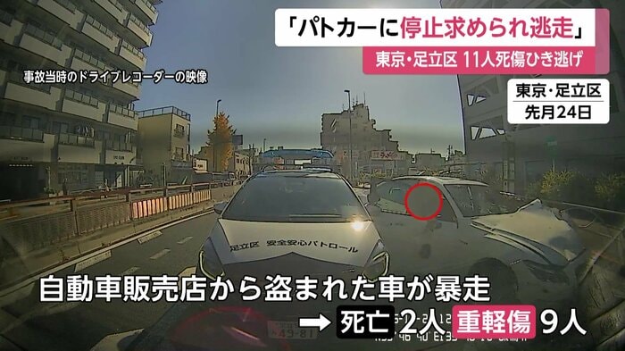 足立区で11月24日、自動車販売店から盗まれた車が暴走し、歩行者らをはね、2人が死亡し9人が重軽傷を負った。