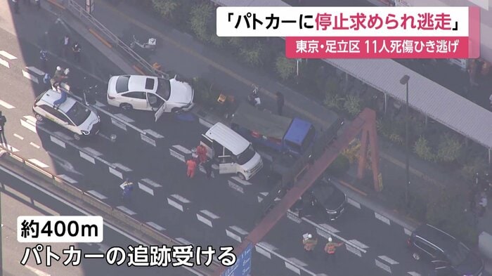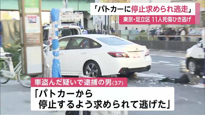 東京・足立区で11人が死傷したひき逃げ事件で、事故を起こした車を盗んだ疑いで逮捕された男が、「パトカーから停止を求められて逃げた」という趣旨の供述していることが分かった。