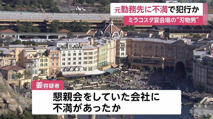 中国籍の姜春雨(きょう・しゅんう)容疑者(34)は1日、東京ディズニーシーの「ホテルミラコスタ」の宴会場に侵入し、会社の懇親会に参加していた男性に刃物を向け「ぶっ殺すぞ」などと脅した疑いで逮捕された。