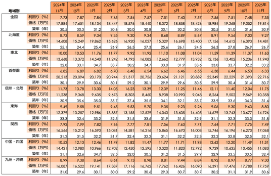 地域別の利回りの動きを見ると、価格上昇が著しい首都圏や関西では変動は比較的小さく、首都圏は前月比+0.03ポイント・前年同月比+0.02ポイント、関西は前月比-0.29ポイント・前年同月比-0.15ポイントと、概ね安定した水準を維持しています。一方、その他の地域では振れ幅が大きく、東海(前月比+1.82 ポイント)では利回りが大幅に上昇しており、利回り面でも地域差が見られました。