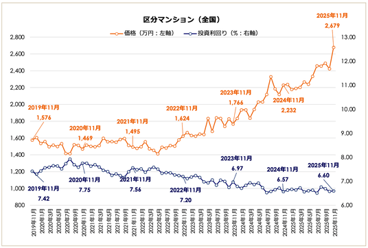 2025年11月期の区分マンション市場(全国平均)は、価格の高騰が際立つ結果となりました。全国平均価格は2,679万円で、前月比で+10.57%と二桁の上昇を記録。前年同月比でも、+20.03%と高水準が継続していることがわかります。一方、全国平均利回りは6.60%で、前月比+0.02ポイント、前年同月比でも+0.03ポイントと横ばいで推移しました。