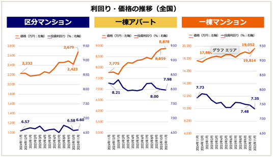 2025年11月期は、区分マンションが前月比+10.57%と急伸したほか、すべての物件種別で直近12年※での最高価格を更新しました。これにともない、一棟マンションや一棟アパートの利回りは全体として低下傾向にあります。