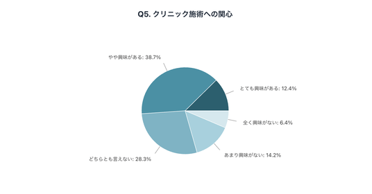 その結果、「とても興味がある」が12.4%、「やや興味がある」が38.7%となり、合計51.1%の方がクリニック施術に興味を示していることが分かりました。