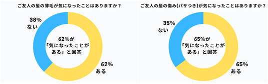 アンケートの結果によると、「ご友人の髪の薄毛が気になったことはありますか?」「ご友人の髪の毛の傷み(パサつき)が気になったことはありますか?」という質問に対し、いずれも6割以上の人が「気になったことがある」と回答。多くの方が、思っている以上に人の髪に注目していることが分かりました。中でも「ご友人の髪のパサつきが気になる」と回答したのは全体の65%で、“髪がパサつく”という毛髪の質感も、見た目印象に多分に影響を与えているということが考えられます。
