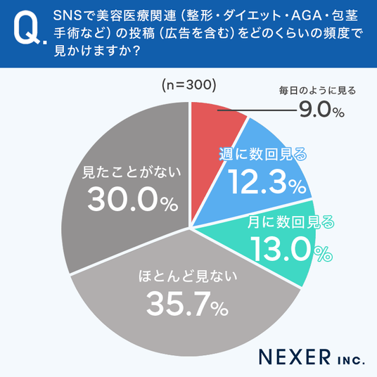 続いて、SNSで美容関連(整形・ダイエット・AGA・包茎手術など)の投稿をどのくらいの頻度で見るかを聞いてみました。
