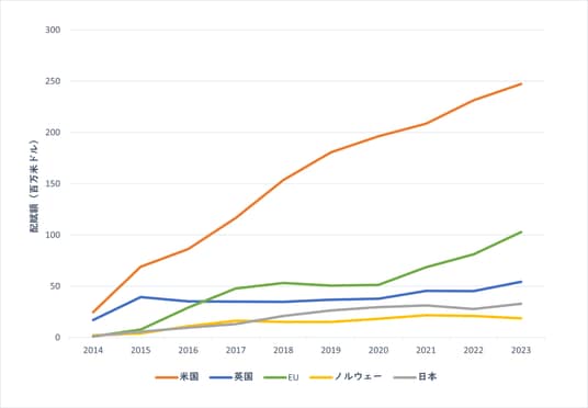 図3:バイオDXに関連する研究プロジェクト賦与額の国別の推移(2014~2023年)