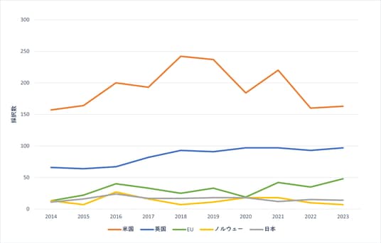 図2:バイオDXに関連する研究プロジェクト件数の国別の推移(2014~2023年)