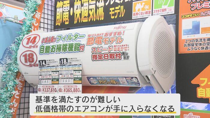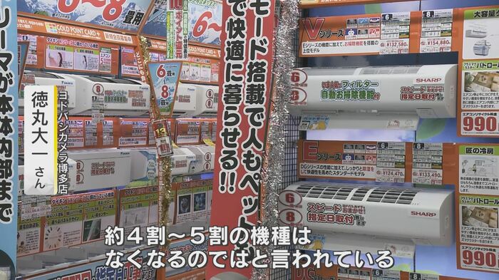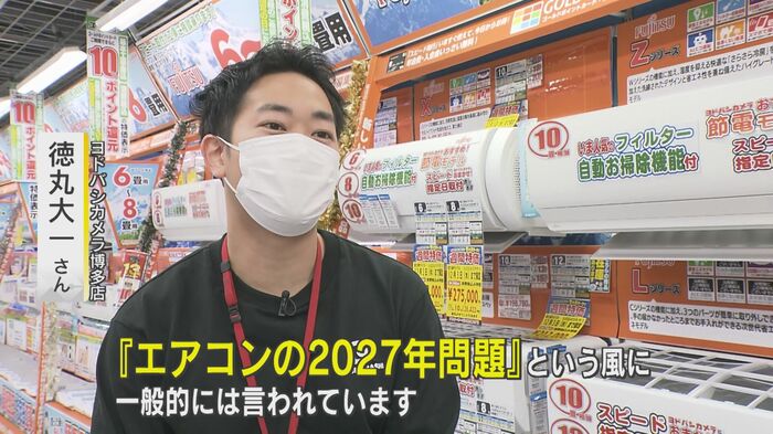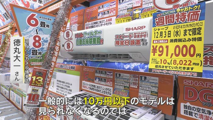 『ヨドバシカメラ博多店』の徳丸さんは、店頭のエアコンを示しながら「表示がオレンジ色、省エネ基準が87%前後のものになるので、2027年度以降は販売されない機種になる。一般的には10万円以下のモデルは、もしかすると見られなくなるのでは…」と説明する。