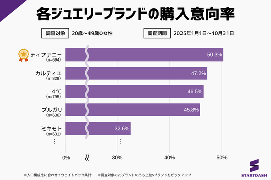 結果を見ると、『ティファニー』が50.3%で最も高い数値となり、唯一過半数を超えました。『カルティエ』(47.2%)、『4℃』(46.5%)、『ブルガリ』(45.8%)がそれに続き、5位には『ミキモト』が32.6%で位置しています。