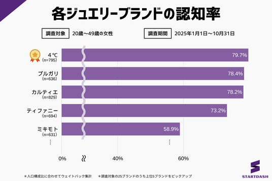 調査の結果、最も高い数値となったのは『4℃』で79.7%でした。僅差で『ブルガリ(BVLGARI)』(78.4%)、『カルティエ(Cartier)』(78.2%)が続き、4位の『ティファニー(Tiffany & Co.)』も73.2%という結果になっています。5位の『ミキモト(MIKIMOTO)』は58.9%でした。