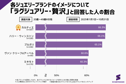 「ラグジュアリー・贅沢」というイメージが当てはまると回答した割合が最も高かったのは『カルティエ』で66.3%でした。僅差で『ハリー・ウィンストン(Harry Winston)』が66.1%、『ブルガリ』が65.1%と続き、さらに『ヴァン クリーフ&アーペル(Van Cleef & Arpels)』が60.6%、『ミキモト』が60.3%という結果になりました。