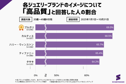 「高品質」というイメージが当てはまると回答した割合が最も高かったのは『ブルガリ』で69.0%でした。これに『カルティエ』が68.5%で続き、さらに『ハリー・ウィンストン』が65.7%、『ティファニー』が65.4%、『ミキモト』が64.2%という結果になりました。