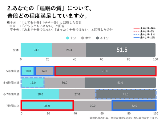 睡眠の質について、「十分」は23.3%、「不十分」は51.5%と、睡眠の量(時間)以上に不満である傾向が明らかに。7時間以上のグループでも、「不十分」と回答した層が32.0%と、約3人に1人は睡眠の質について不満であることが分かりました。