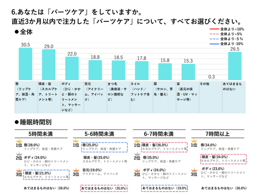 一方で「あてはまるものはない」と回答した割合は全体で26.5%に対し、睡眠時間別では6~7時間未満のグループが19.0%と最も低く、他のグループと比べて何らかのパーツケアをしている人が多い傾向がうかがえます。