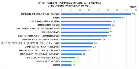 2026年に「トレンドになると思う」(感じる・予感がする)と考える食材は、麹、甘酒、キムチ、ヨーグルトなどの「発酵食品」(75人)が最も多く、続いて「冷凍野菜」(64人)、「サステナブル食材※」(54人)がランクイン。食材選びにおいて、“からだによい”だけでなく“手間を省ける”、“環境にやさしい”といった、多面的な価値観が重視される結果となりました。