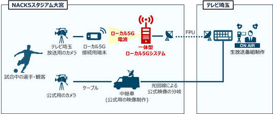 NTT株式会社(以下、NTT)、NTT東日本株式会社(以下、NTT東日本)は、株式会社テレビ埼玉(以下、テレビ埼玉)と、公益社団法人日本プロサッカーリーグ(以下、Jリーグ)協力の元、2025年11月23日(日)にNACK5スタジアム大宮で開催された、「明治安田J2リーグ 第37節 RB大宮アルディージャ vs 徳島ヴォルティス」において、ローカル5Gを活用した高画質・低遅延で安定的な映像伝送によるTV生中継の実証実験を実施し、放送事業者における映像制作現場へのローカル5Gの実用性を確認しました。
