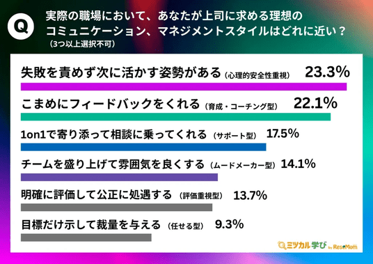 「実際の職場において、あなたが上司に求める理想のコミュニケーション、マネジメントスタイルはどれに近いですか?(3つ以上選択不可)」と質問したところ、最も多い回答は「失敗を責めず次に活かす姿勢がある(心理的安全性重視)(23.3%)」でした。次に、1.2ポイント差で「こまめにフィードバックをくれる(育成・コーチング型)(22.1%)」という回答です。続いて「1on1で寄り添って相談に乗ってくれる(サポート型)(17.5%)」との回答が寄せられました。