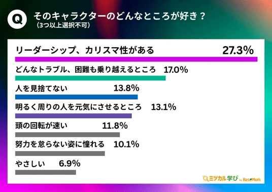 1問目で回答したキャラクターについて「どんなところが好きですか?(3つ以上選択不可)」と質問したところ、「リーダーシップ、カリスマ性がある(27.3%)」や「どんなトラブル、困難も乗り越えるところ(17.0%)」、さらに「頭の回転が速い(11.8%)」「努力を怠らない姿に憧れる(10.1%)」「やさしい(6.9%)」といった、キャラクター自身の性格や物事に取り組む姿勢について着目した回答が多い結果でした。