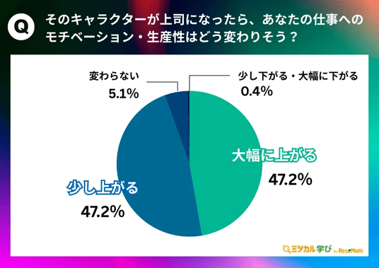さらに、1問目で回答したキャラクターについて「そのキャラクターが上司になったら、あなたの仕事へのモチベーション・生産性はどう変わりそうですか?」と質問したところ、「大幅に上がる(47.2%)」と「少し上がる(47.2%)」、合わせて94.4%の方が「上がる」と回答しました。