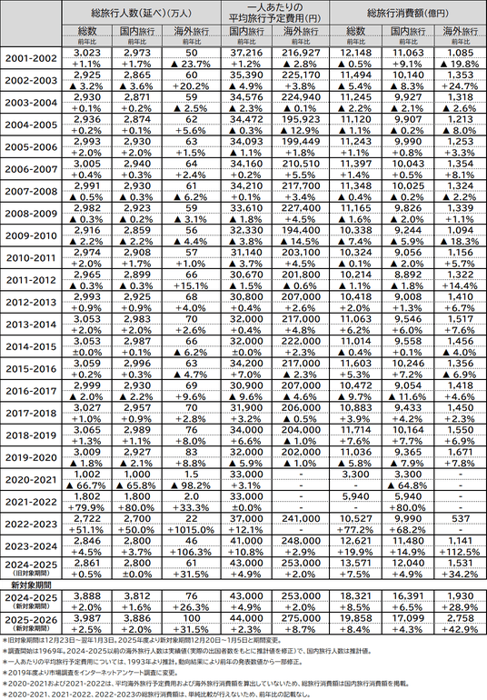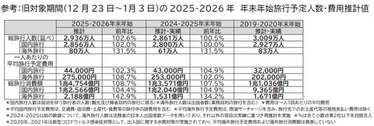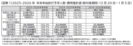 JTBは、「年末年始(12月20日~1月5日)に、1泊以上の旅行に出かける人」の旅行動向見通しをまとめました。本レポートは、1泊以上の日本人の旅行について、各種経済動向や消費者行動調査、運輸・観光関連データ、JTBグループが実施したアンケート調査などから推計したもので、1969年から継続的に調査を実施しています。なお、前年までは調査対象期間を12月23日~1月3日(旧対象期間)としていましたが、時勢に合わせ今年から12月20日~1月5日(新対象期間)に変更しています。
