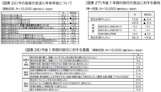 JTBが実施したアンケートで、「今の自身の生活と年末年始について」の状況を聞いたところ、「昨年より収入が増えた(6.8%)」、「昨年よりボーナスが増えそうだ(3.8%)」は前年から減少、「昨年より収入が減った(14.2%)」、「昨年よりボーナスが減りそうだ(12.7%)」、「家計に余裕はない(25.9%)」はそれぞれ増加となっており、収入面での減少傾向がみられます。また、「趣味や旅行などにかける費用を減らしている(15.6%)」は「趣味や旅行などにかける費用は減らしていない(9.1%)」を6.5ポイント上回り、「先行きがわからないので、大きな支出は控えておきたい(18.8%)」が「先行きがわからないので、今のうちに大きな支出を考えたい(4.8%)」を14ポイント上回るなど、収入減が消費意向にも影響を与えている状況が読み取れます(図表26)。