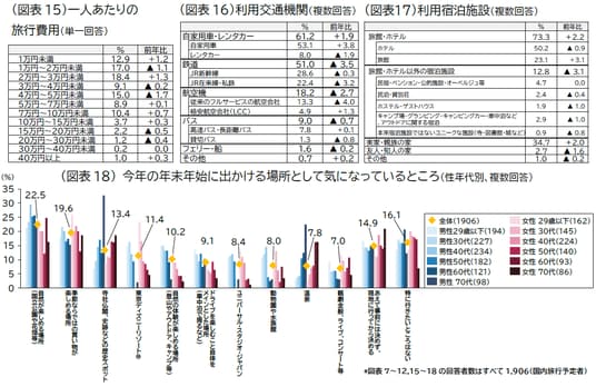 一人あたりの旅行費用:全体では、「2万円~3万円未満(18.4%)」が最も多くなり、前年より1.3ポイント増加しました。次いで「1万円~2万円未満(17.0%)」は前年から1.1ポイント減少、「4万円~5万円未満(15.0%) 」は1.7ポイントの減少となりました。一方で「1万円未満(12.9%、前年比1.2ポイント増)」、「7万円~10万円未満(10.4%、同0.7ポイント増)」はいずれも増加しており、旅行費用は旅行形態や目的地によって多様な傾向を示しているといえます(図表15)。