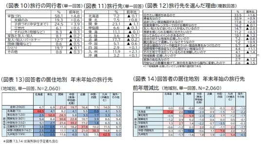 同行者:「子供づれ(中学生まで)の家族旅行(24.5%)」が最も多く、3.9ポイントの増加。次いで「ひとり(19.7%)」、「夫婦のみ(19.3%)」となり、「家族づれ」全体では4.8ポイント増加しています。一方、「友人・知人・パートナー(12.7%)」は3.6ポイントの減少となりました。経済的な余裕が減り、友人と誘い合っての旅行がしづらいことなどから、今年は家族で過ごす、という選択肢を取る人が多いことも考えられます(図表10)。