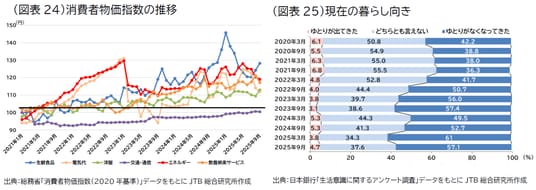 物価に関しては、主な品目の消費者物価指数を見ると、「生鮮食品」を代表として、日常生活に必要なものの上昇傾向が続いています(図表24)。また、給与と消費動向については、実質賃金が2025年9月時点で9か月連続のマイナスとなりました。日本銀行の「生活意識に関するアンケート調査」の「現在の暮らし向き」でも、2021年以降、「ゆとりがなくなってきた」が長期的に上昇傾向となっています(図表25)。
