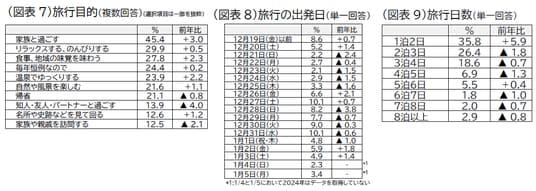 旅行目的:「家族と過ごす(45.4%、前年比3.0ポイント増)」が最も多く、次いで「リラックスする、のんびりする(29.9%、同0.5ポイント増)」となりました。また「食事、地域の味覚を味わう(27.8%)」は2.3ポイントの増加、「温泉でゆっくりする(23.9%)」は2.2ポイントの増加、「自然や風景を楽しむ(21.6%)」は1.1ポイントの増加となり、グルメ・温泉・自然景観などを楽しむ傾向が強いです。一方、「帰省(21.1%、同0.8ポイント減)」、「知人・友人・パートナーと過ごす(13.9%、同4.0ポイント減)」、「家族や親戚を訪問する(12.5%、同2.1ポイント減)」はいずれも減少しました(図表7)。