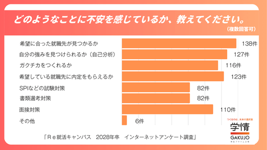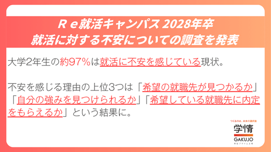 株式会社学情(本社:東京都中央区)は、2028年3月卒業(修了)予定の大学生・大学院生を対象に、「就職活動に対する不安」についてインターネットアンケートを実施しました。今回の調査では、約97%が「不安を感じている」と回答しました。また、具体的に不安を感じる理由の上位3つは「希望の就職先が見つかるか」「自分の強みを見つけられるか」「希望している就職先に内定をもらえるか」という結果に。一方で、就職活動に不安を感じていない学生の回答結果として最も多かったのは「実際の就活が始まるのはまだ先だから」というものでした。