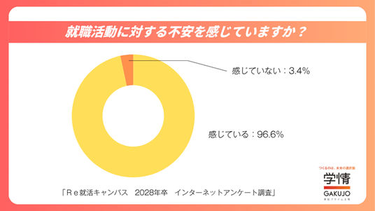 「就職活動に対する不安を感じていますか?」という質問には、96.6%が「感じている」と回答。ほとんどの学生が就活に対して不安を感じていることが分かりました。