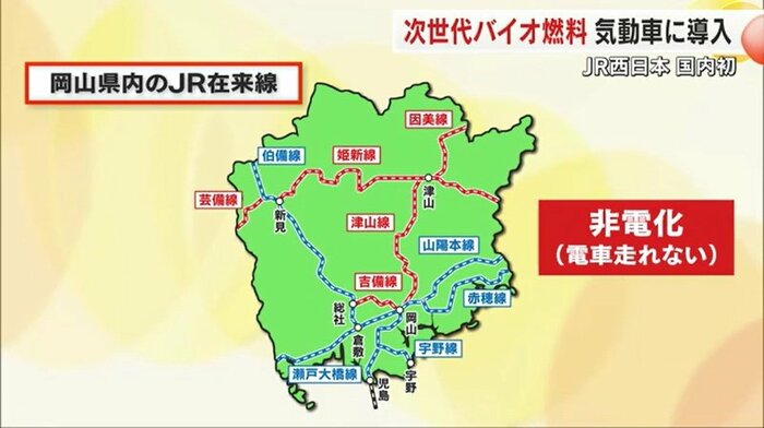 JR西日本は11月11日、二酸化炭素の排出を減らす次世代のバイオ燃料を岡山県内の気動車に導入した。
