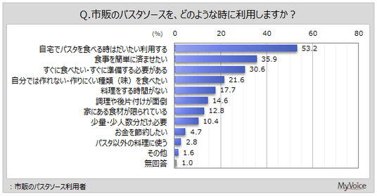 市販のパスタソース利用者に、どのような時にパスタソースを利用するかを聞いたところ(複数回答)、「自宅でパスタを食べる時はだいたい利用する」が53.2%、「食事を簡単に済ませたい」が35.9%、「すぐに食べたい・すぐに準備する必要がある」30.6%です。